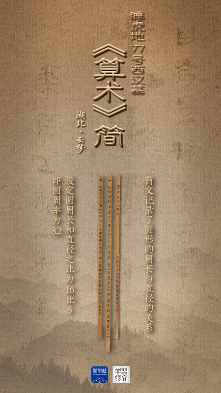 簡牘里的《算術(shù)》,是古人科學智慧的精彩呈現(xiàn)。三枚關(guān)于計算圓形田地面積方法的西漢簡牘保存完好,為首次公開展出?!坝斜瀸碇笔c五侍之”,睡虎地漢簡中列舉的這道算術(shù)題顯示,周長和直徑之比為16:5,即圓周率為3.2,證明秦漢之際已有人認識到比3更精確的圓周率,為出土簡牘所僅見,尤其珍貴。