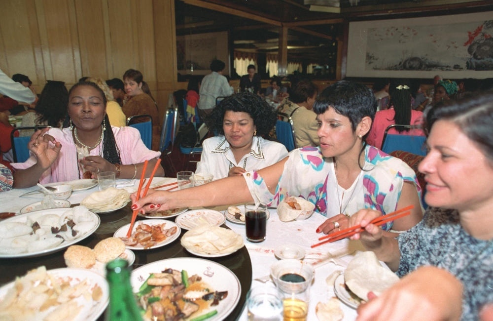 1995年9月10日,來(lái)華參加世界婦女大會(huì)的巴西代表結(jié)伴來(lái)到北京和平門全聚德烤鴨店,品嘗北京烤鴨。