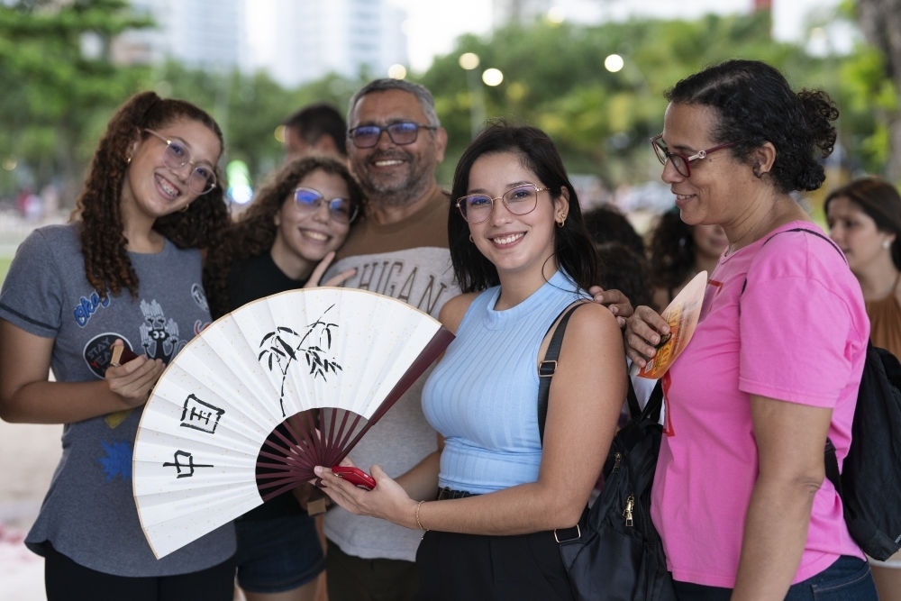 2024年2月3日,一名女子在巴西累西腓舉行的中國(guó)春節(jié)慶祝活動(dòng)上展示自己書寫的扇面。
