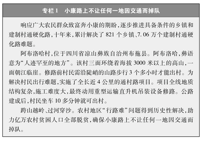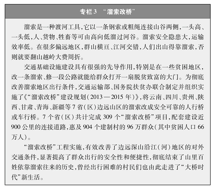 解決特殊地區(qū)出行難題。改一條溜索、修一段公路就能給群眾打開一扇脫貧致富的大門。為了保障偏遠(yuǎn)山區(qū)百姓安全出行,推動“溜索改橋”建設(shè),專項資金支持、精心組織實施,用3年時間徹底改善了溜索地區(qū)出行條件(專欄3)。推進(jìn)“直過民族”③和人口較少民族聚居區(qū)農(nóng)村公路建設(shè),解決民族地區(qū)交通閉塞的突出問題,加快民族地區(qū)脫貧致富步伐。