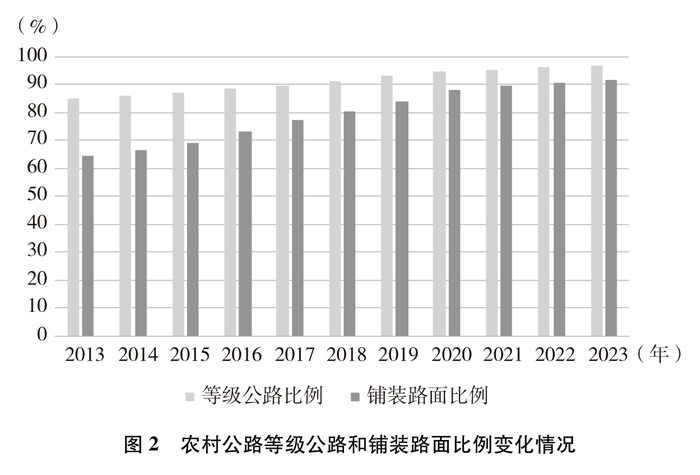 技術(shù)等級逐年提高。截至2023年底,農(nóng)村公路等級路②里程及比例分別達(dá)到445萬公里和96.8%,鋪裝路面里程及比例分別達(dá)到422萬公里和91.8%,十年間分別提高了11.9個百分點、27.2個百分點。