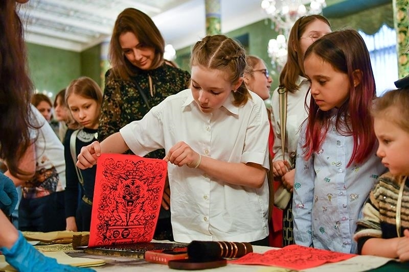 2023年6月2日,在位于俄羅斯莫斯科的中國駐俄羅斯大使館舉行的一場中國傳統(tǒng)文化體驗(yàn)活動上,一名小朋友體驗(yàn)雕版印刷。