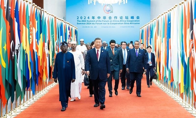 2024年9月5日,習(xí)近平主席在北京人民大會堂出席中非合作論壇北京峰會開幕式并發(fā)表主旨講話。這是習(xí)主席同外方領(lǐng)導(dǎo)人共同步入會場。