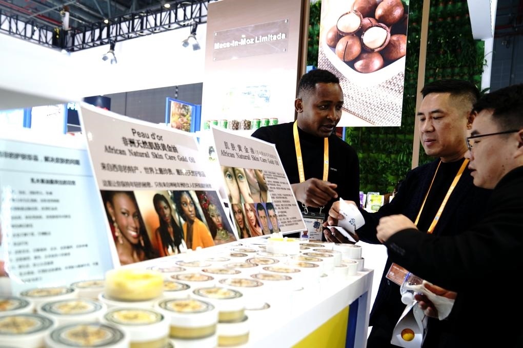 2024年11月7日,參展商在第七屆進(jìn)博會食品及農(nóng)產(chǎn)品展區(qū)的非洲產(chǎn)品專區(qū)介紹產(chǎn)品。新華社記者 張建松 攝