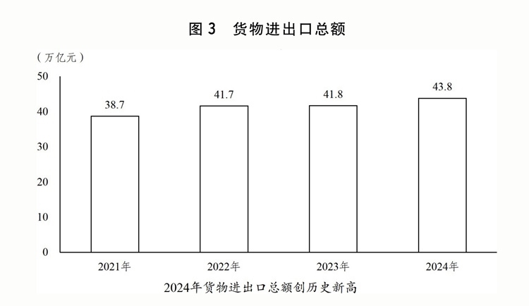 (六)加快建設(shè)更高水平開放型經(jīng)濟新體制,高水平對外開放取得積極成效。全年貨物進出口總額43.8萬億元,服務(wù)進出口總額7.5萬億元,外商直接投資1162億美元,境外直接投資1438億美元。年末外匯儲備規(guī)模達32024億美元。