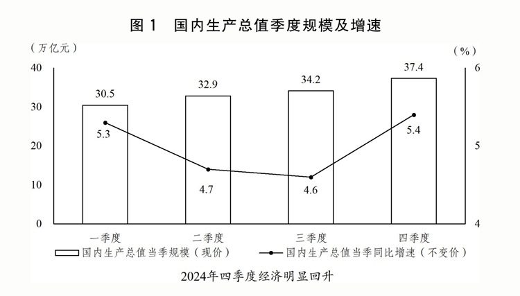 (一)因時因勢加強和創(chuàng)新宏觀調(diào)控,推動經(jīng)濟回升向好。扎實開展宏觀政策逆周期調(diào)節(jié),加大政策力度,釋放政策效能,特別是9月26日中央政治局會議果斷部署一攬子增量政策,市場預(yù)期、社會信心有效提振,四季度經(jīng)濟明顯回升。全年國內(nèi)生產(chǎn)總值(GDP)134.9萬億元、增長5%,其中,一、二、三產(chǎn)業(yè)分別增長3.5%、5.3%、5%。