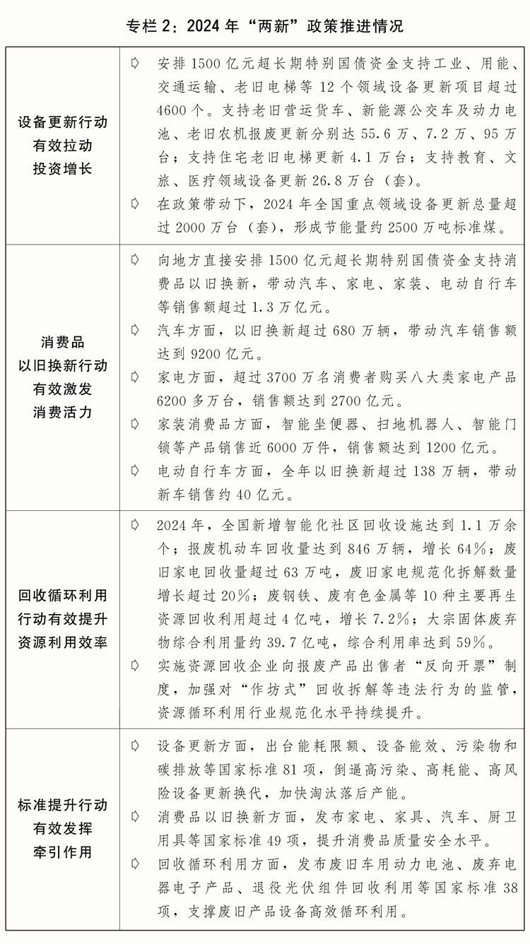 四是加力擴圍實施“兩新”政策。安排超長期特別國債5000億元支持大規(guī)模設(shè)備更新和消費品以舊換新,統(tǒng)籌投資、財政、金融等綜合性政策,深入推進設(shè)備更新、消費品以舊換新、回收循環(huán)利用、標(biāo)準(zhǔn)提升四大行動。進一步加大重點領(lǐng)域設(shè)備更新項目支持力度,加力實施設(shè)備更新貸款貼息,加快存量設(shè)備評估診斷和項目儲備。進一步支持消費品以舊換新,擴大汽車報廢更新支持范圍,完善汽車置換更新補貼標(biāo)準(zhǔn),實施手機、平板等數(shù)碼產(chǎn)品購新補貼,積極支持家裝消費品換新,簡化補貼申領(lǐng)和支付流程,完善資金監(jiān)管機制,嚴(yán)厲打擊價格欺詐和違規(guī)騙補套補行為。