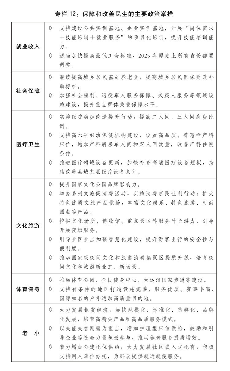 一是實施提振消費專項行動。制定提升消費能力、增加優(yōu)質(zhì)供給、改善消費環(huán)境政策舉措,穩(wěn)定大宗消費、擴大服務(wù)消費、拓展新型消費、合理增加公共消費,推動消費提質(zhì)升級。多渠道促進居民增收,推動中低收入群體增收減負(fù),完善勞動者工資正常增長機制。因城施策調(diào)減房地產(chǎn)消費限制性措施,推動建設(shè)安全、舒適、綠色、智慧的“好房子”,更好滿足人民群眾剛性和改善性住房需求、高品質(zhì)居住需要。進一步優(yōu)化汽車限購管理政策,加快構(gòu)建充電基礎(chǔ)設(shè)施體系,開展汽車流通消費改革試點。加快拓展文化、旅游、體育、健康、養(yǎng)老、托幼、家政、數(shù)字等服務(wù)消費,實施服務(wù)消費提質(zhì)惠民活動、“百城百區(qū)”文化和旅游消費行動計劃。加快培育帶動性廣、顯示度高的消費新場景,支持影視游戲創(chuàng)作與中華優(yōu)秀傳統(tǒng)文化、特色旅游資源相結(jié)合等融合式沉浸式消費新場景發(fā)展。積極發(fā)展首發(fā)經(jīng)濟、冰雪經(jīng)濟、銀發(fā)經(jīng)濟。完善游艇、房車露營等新型消費領(lǐng)域管理機制和行業(yè)標(biāo)準(zhǔn),促進“人工智能+消費”,優(yōu)化消費新業(yè)態(tài)新領(lǐng)域市場準(zhǔn)入環(huán)境,加快推動各類新技術(shù)應(yīng)用推廣并向消費級產(chǎn)品轉(zhuǎn)化。清理對消費的不合理限制。深入實施優(yōu)化消費環(huán)境三年行動,加強消費信用體系和質(zhì)量標(biāo)準(zhǔn)體系建設(shè),規(guī)范網(wǎng)絡(luò)銷售、直播帶貨領(lǐng)域不合理經(jīng)營行為,強化消費者權(quán)益保護。落實和優(yōu)化帶薪年休假制度。完善外國人入境居留政策和免稅店政策,推動擴大入境消費。深化國際消費中心城市建設(shè)。