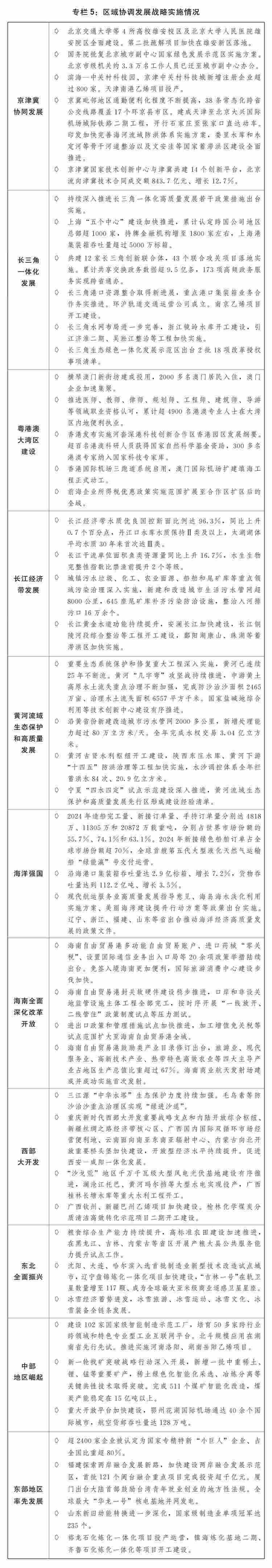 一是區(qū)域協(xié)調(diào)發(fā)展積厚成勢。京津冀協(xié)同發(fā)展走深走實,在京相關(guān)高校、醫(yī)院、中央企業(yè)總部及二三級子公司分批向雄安新區(qū)疏解,北京城市副中心行政辦公、商務(wù)服務(wù)、文化旅游等功能不斷完善,進一步支持天津濱海新區(qū)高質(zhì)量發(fā)展若干政策措施出臺實施,三省市互聯(lián)互通交通網(wǎng)絡(luò)更加完善、產(chǎn)業(yè)鏈上下游協(xié)作持續(xù)強化、公共服務(wù)共建共享水平進一步提升。長三角一體化高質(zhì)量發(fā)展深入推進,生態(tài)綠色一體化發(fā)展示范區(qū)改革授權(quán)壓茬推進,港口資源整合、軌道互聯(lián)互通等取得新進展,上海“五個中心”建設(shè)進一步加快?;浉郯拇鬄硡^(qū)建設(shè)邁上新臺階,橫琴粵澳深度合作區(qū)封關(guān)“一線”“二線”分線管理運行順利,超1.6萬名澳門居民在合作區(qū)居住生活,支持河套深港科技創(chuàng)新合作區(qū)深圳園區(qū)、香港園區(qū)聯(lián)動發(fā)展,創(chuàng)新要素跨境流動更加便捷。長江經(jīng)濟帶共抓大保護、不搞大開發(fā)成效顯著,進一步抓實抓好長江大保護工作三年行動計劃出臺實施,長江十年禁漁取得明顯成效,長江干流連續(xù)5年保持Ⅱ類水質(zhì),綜合立體交通走廊加快構(gòu)建,沿江高鐵全線開工建設(shè)。黃河流域生態(tài)保護和高質(zhì)量發(fā)展邁出堅實步伐,農(nóng)業(yè)面源、城鎮(zhèn)生活、工業(yè)和尾礦庫污染治理深入推進,8萬余個入河排污口開展溯源整治,一批生態(tài)保護修復(fù)重點項目加快建設(shè),黃河干流連續(xù)3年保持Ⅱ類水質(zhì)。海洋強國建設(shè)深入推進,海洋強省、現(xiàn)代海洋城市、全國海洋經(jīng)濟發(fā)展示范區(qū)創(chuàng)新發(fā)展,海洋生態(tài)環(huán)境質(zhì)量持續(xù)改善,海洋生產(chǎn)總值超10萬億元。