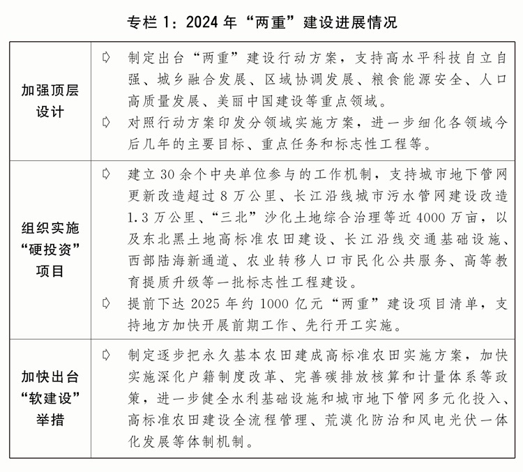 三是加力推進“兩重”建設(shè)。進一步完善自上而下的工作機制,加強“兩重”建設(shè)項目儲備,更好統(tǒng)籌“硬投資”與“軟建設(shè)”。安排超長期特別國債8000億元支持“兩重”建設(shè),進一步優(yōu)化具體投向并提高項目支持比例,重點支持基礎(chǔ)研究能力提升、未來產(chǎn)業(yè)發(fā)展、東北等重點地區(qū)高標(biāo)準(zhǔn)農(nóng)田建設(shè)、大中型灌區(qū)新建改造及大中型引調(diào)水和大中型水庫建設(shè)、長江經(jīng)濟帶生態(tài)環(huán)境保護和綠色發(fā)展、農(nóng)業(yè)轉(zhuǎn)移人口市民化公共服務(wù)體系建設(shè)、高等教育提質(zhì)升級、城市地下管網(wǎng)管廊建設(shè)改造等方面任務(wù),強化超長期貸款等配套融資,高質(zhì)量推進“硬投資”項目謀劃實施。加大力度推動“軟建設(shè)”政策落地見效。
