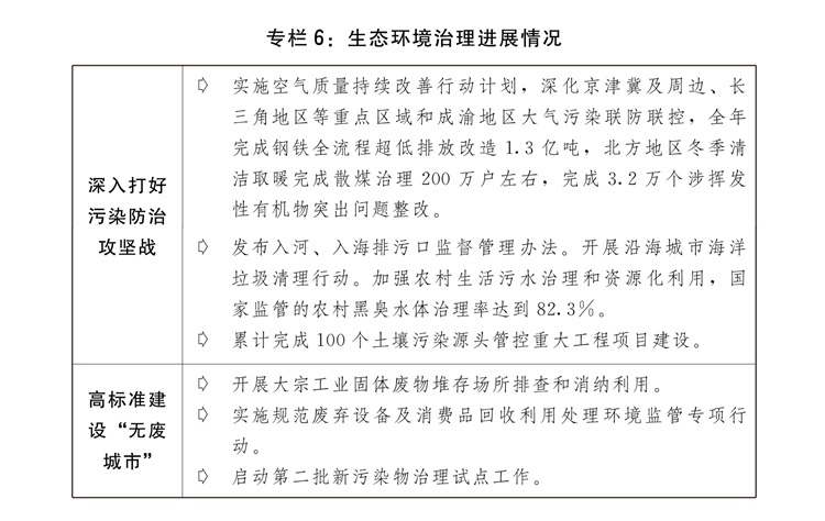 (九)堅定不移推進生態(tài)文明建設(shè),全面綠色轉(zhuǎn)型取得積極進展。出臺加快經(jīng)濟社會發(fā)展全面綠色轉(zhuǎn)型的意見,持續(xù)深入打好污染防治攻堅戰(zhàn),積極穩(wěn)妥推進碳達峰碳中和,大力實施全面節(jié)約戰(zhàn)略,美麗中國建設(shè)成效明顯。