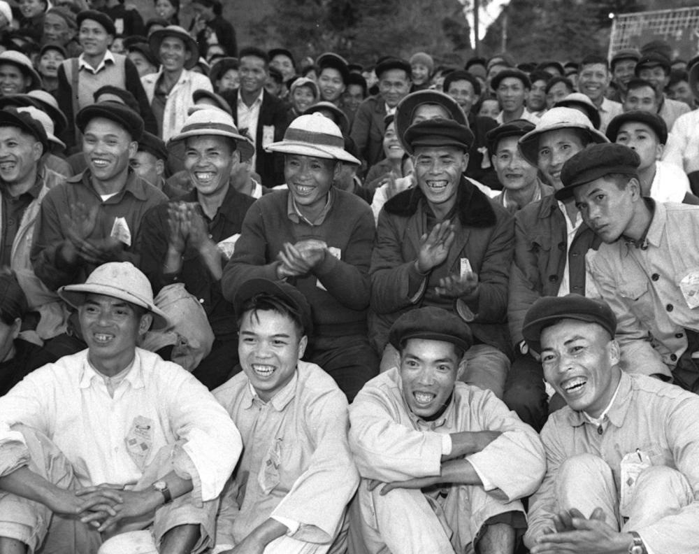 1959年12月,來自越南的客人在兩國(guó)邊境居民慶祝共建水利工程完工聯(lián)歡會(huì)上觀看演出。