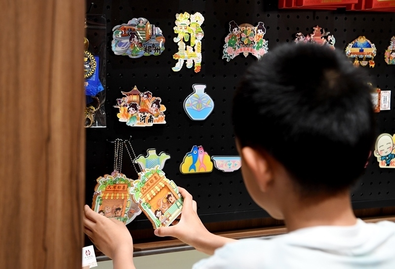 6月14日,游客在大河村遺址博物館新館文創(chuàng)區(qū)選購產(chǎn)品。