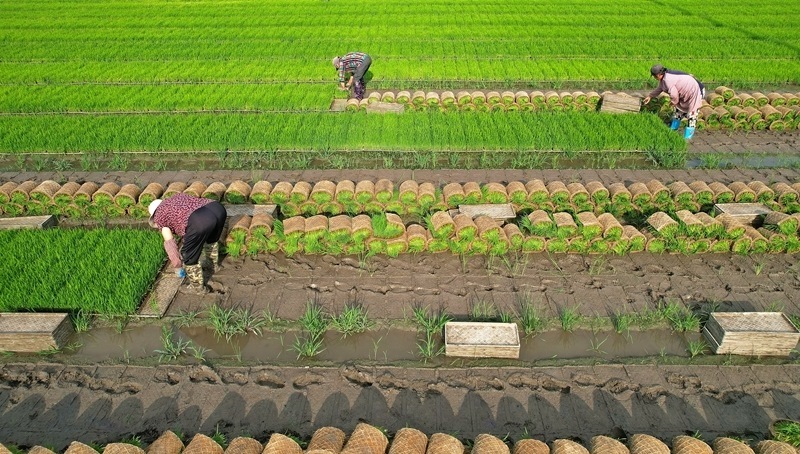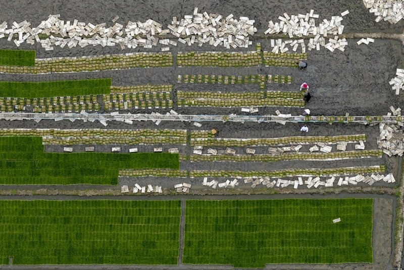 6月18日,在江蘇省海安市墩頭鎮(zhèn)千步村,農(nóng)民起水稻秧苗,準(zhǔn)備進(jìn)行水稻機(jī)插(無(wú)人機(jī)照片)。