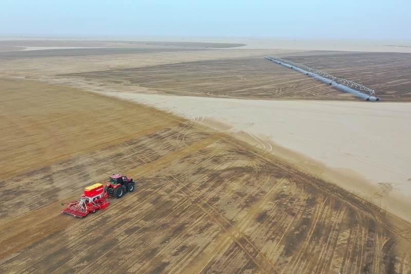 在新疆和田地區(qū)策勒縣4萬畝苜蓿種植基地,農(nóng)機(jī)手駕駛機(jī)械在播種苜蓿(9月9日攝,無人機(jī)照片)。