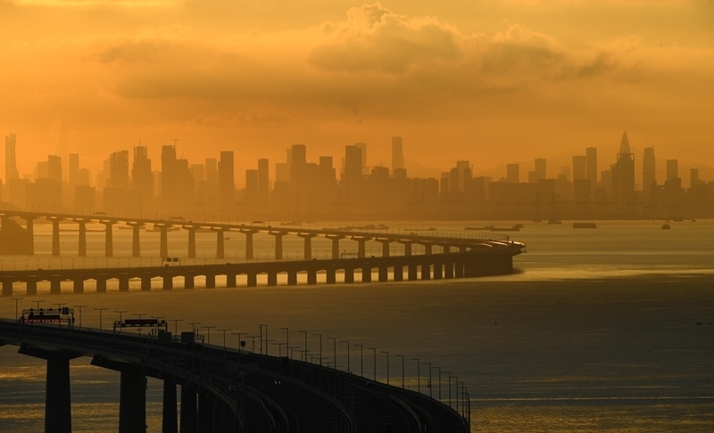 9月14日拍攝的沐浴在晨曦之中的深中通道與遠處的深圳市區(qū)。