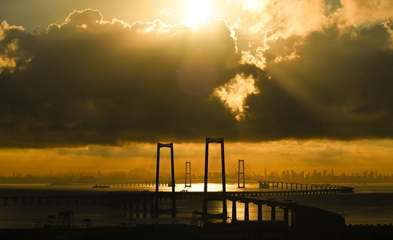 珠江口伶仃洋上,深中通道沐浴在晨曦之中,長虹臥波、美不勝收。