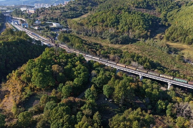 9月27日,滿載大宗品類貨物的入境列車在濱綏鐵路綏芬河至國(guó)境線提質(zhì)改造工程新線路上行駛(無(wú)人機(jī)照片)。
