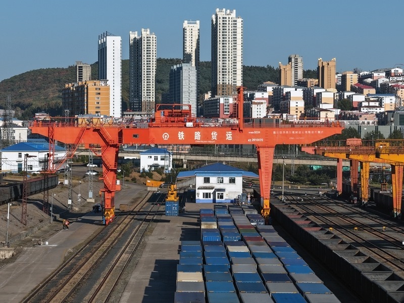 9月27日,滿載貨物的列車在綏芬河站北場(chǎng)進(jìn)行換裝作業(yè)(無(wú)人機(jī)照片)。
