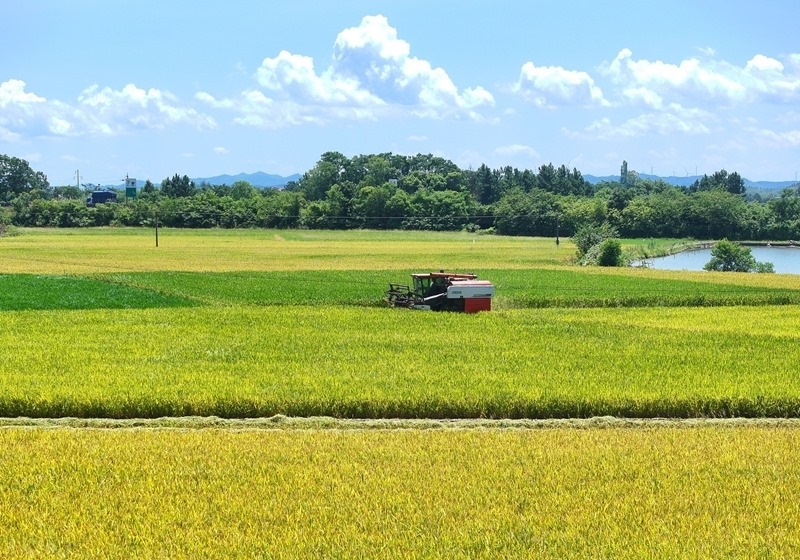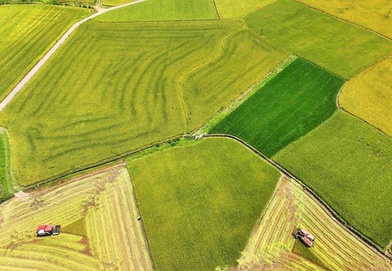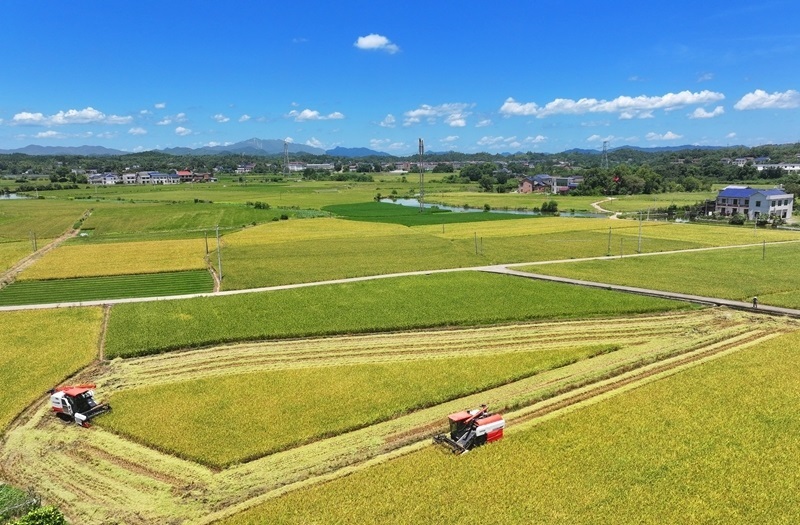 7月3日,在湖南省衡陽(yáng)市衡山縣白果鎮(zhèn),村民駕駛收割機(jī)收割早稻(無(wú)人機(jī)照片)。