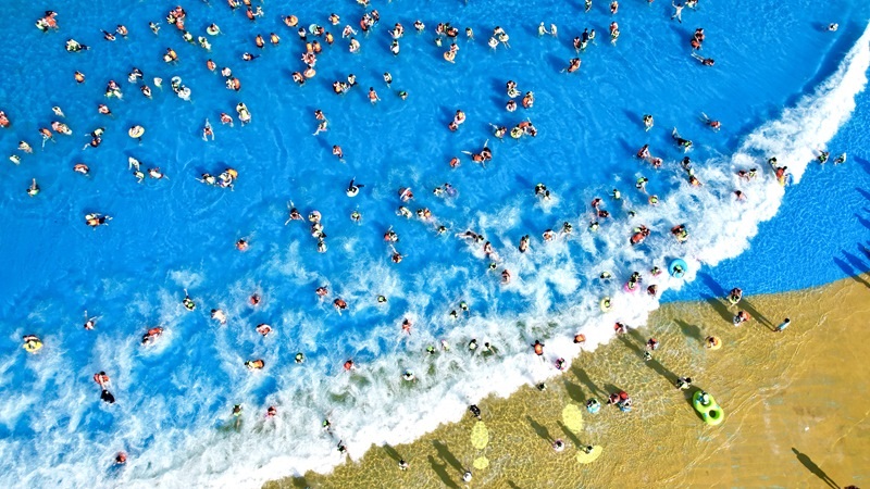7月5日,浙江省湖州市長興縣太湖圖影旅游度假區(qū)龍之夢(mèng)樂園嬉水世界,游客親水消暑(無人機(jī)照片)。