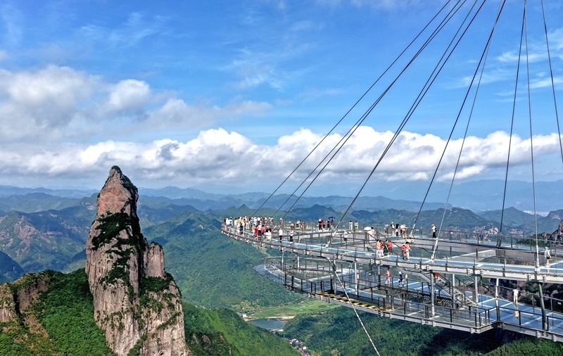 7月5日,游客在浙江省臺(tái)州市仙居縣神仙居景區(qū)南天頂玻璃觀景臺(tái)上游玩(無人機(jī)照片)。