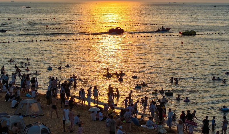 7月5日,游客在山東省威海市國際海水浴場(chǎng)親水消暑(無人機(jī)照片)。