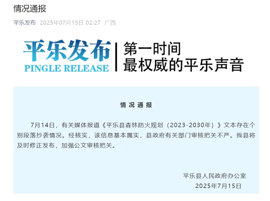 7月14日,有關(guān)媒體報(bào)道《平樂縣森林防火規(guī)劃(2023-2030年)》文本存在個別段落抄襲情況。經(jīng)核實(shí),該信息基本屬實(shí),縣政府有關(guān)部門審核把關(guān)不嚴(yán)。我縣將及時(shí)修正發(fā)布,加強(qiáng)公文審核把關(guān)。