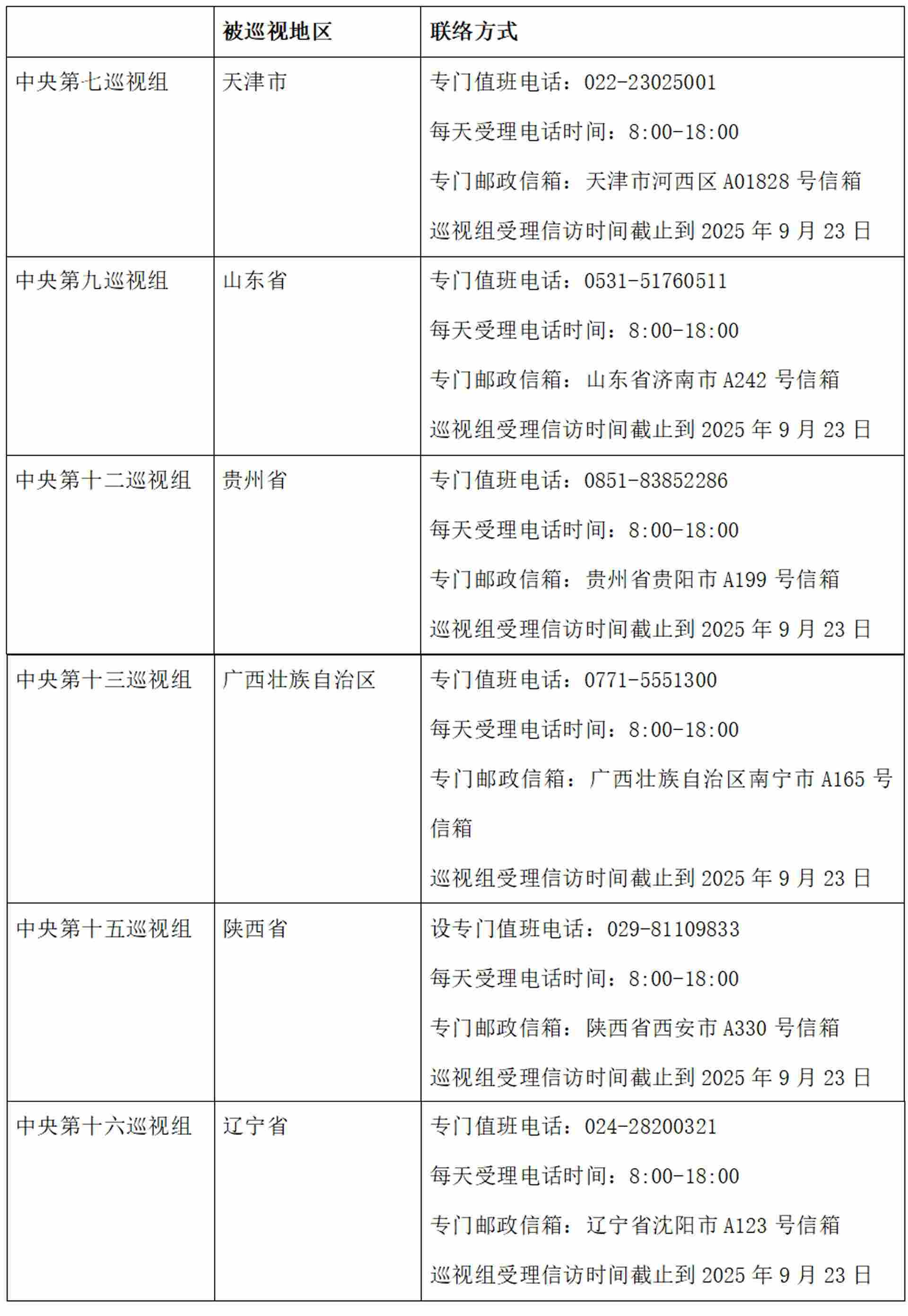 已進(jìn)駐中央巡視組聯(lián)絡(luò)方式: