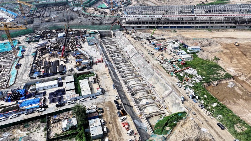 7月30日拍攝的濟濱高鐵機場隧道施工現(xiàn)場(無人機照片)。