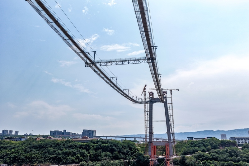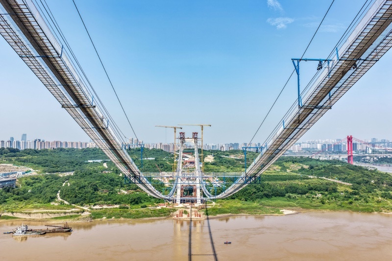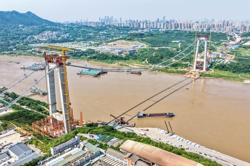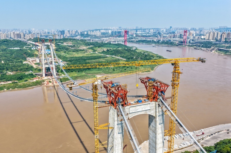 當(dāng)日,由重慶城投集團(tuán)投資、城投建設(shè)公司組織建設(shè)、中國(guó)鐵建大橋局承建的黃桷沱長(zhǎng)江大橋順利完成主纜架設(shè)工作,標(biāo)志著大橋建設(shè)即將進(jìn)入鋼桁梁吊裝工序。黃桷沱長(zhǎng)江大橋全長(zhǎng)1260米,主跨765米,為單跨懸吊雙塔三跨連續(xù)鋼桁梁懸索橋,是國(guó)內(nèi)最大跨徑公軌兩用懸索橋。黃桷沱長(zhǎng)江大橋是渝長(zhǎng)高速?gòu)?fù)線連接道工程的控制性節(jié)點(diǎn)工程,建成后將成為聯(lián)系重慶主城區(qū)長(zhǎng)江南北兩岸的重要交通干道。