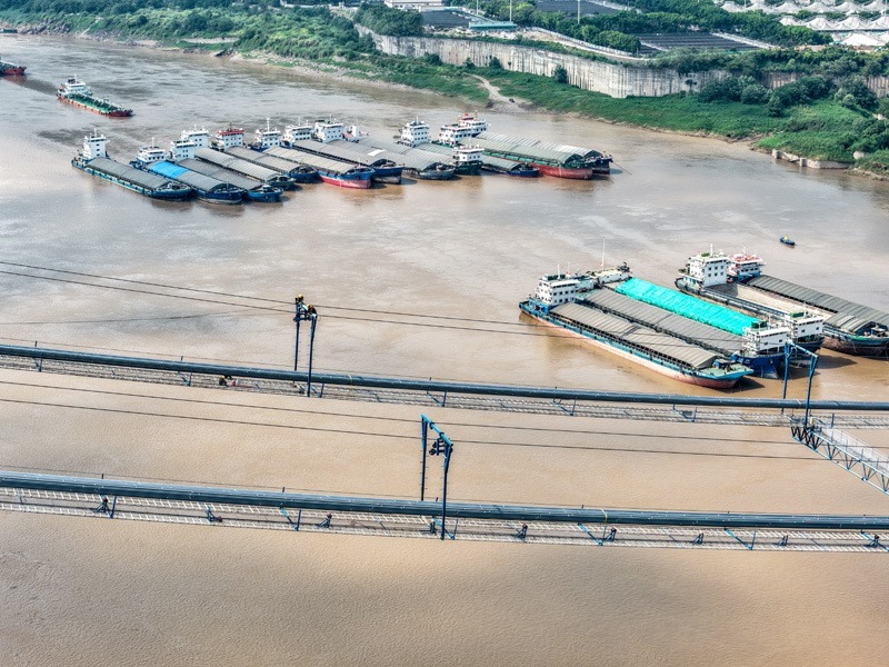 7月30日,在重慶黃桷沱長(zhǎng)江大橋建設(shè)現(xiàn)場(chǎng),工人在施工作業(yè)(無(wú)人機(jī)照片)。
