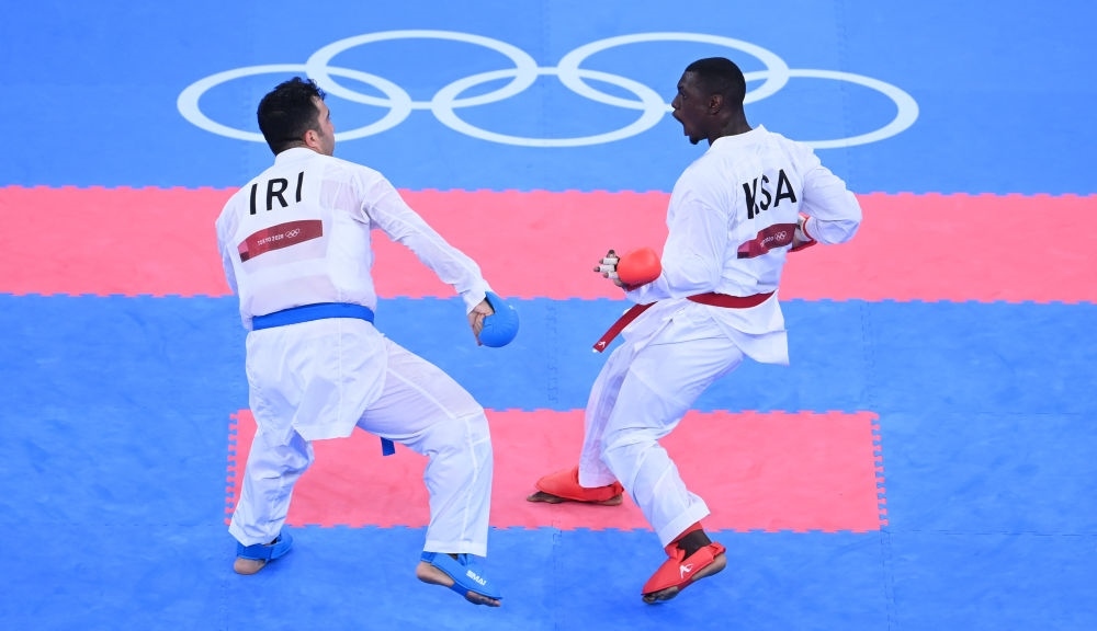 空手道作為“新增項目”之一進入了東京奧運會,但未能在巴黎奧運會上繼續(xù)入圍。圖為東京奧運會,伊朗選手薩賈德(左)與沙特選手哈米迪在空手道比賽中。黃宗治 攝