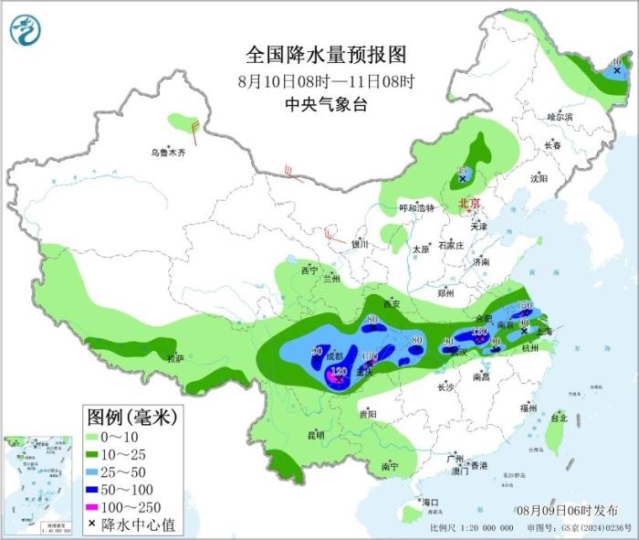 8月10日08時至11日08時,陜西南部、河南南部、四川大部、重慶大部、湖北大部、安徽中南部、江蘇中南部、上海、浙江北部以及內(nèi)蒙古東南部、黑龍江東北部等地部分地區(qū)有中到大雨,其中,安徽西南部、江蘇中南部、湖北東部和西南部、四川盆地中東部和西南部、重慶中西部和東北部、云南東北部等地部分地區(qū)有暴雨或大暴雨(100~150毫米)。內(nèi)蒙古西北部、新疆沿天山地區(qū)等地部分地區(qū)有4~5級風。東海北部海域?qū)⒂?~7級風、陣風8級,黃海南部海域、東海南部海域?qū)⒂?~6級風、陣風7級。