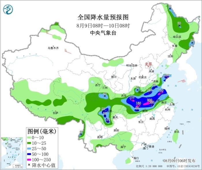 8月9日08時至10日08時,青海東南部、甘肅南部、川西高原北部、陜西南部、河南大部、山東東部和南部、湖北大部、安徽中北部、江蘇中北部、四川盆地西部和南部以及黑龍江中北部、吉林東部、西藏東南部等地部分地區(qū)有中到大雨,其中,陜西南部、山東東部和南部、河南東北部和中南部、安徽中北部、江蘇北部、湖北北部、四川盆地西部和南部等地部分地區(qū)有暴雨或大暴雨(100~200毫米)。新疆北疆北部和東部、山東半島等地部分地區(qū)有4~5級風。黃海中部海域?qū)⒂?~7級風、陣風8級,黃海南部海域、東海北部海域?qū)⒂?~7級風、陣風8級,渤海、東海南部海域?qū)⒂?~6級風、陣風7級。