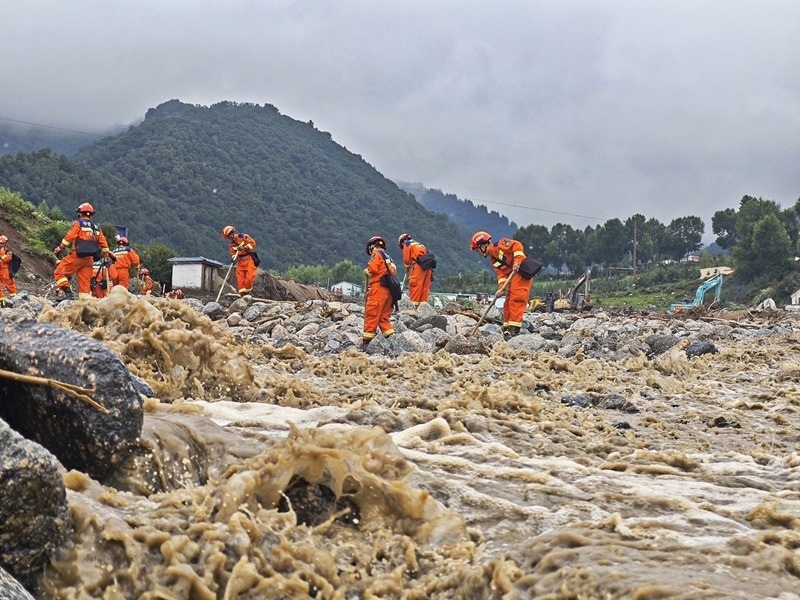 8月9日,甘肅省森林消防總隊(duì)消防員在榆中縣馬坡鄉(xiāng)舊莊溝村沿河道搜尋被困人員。