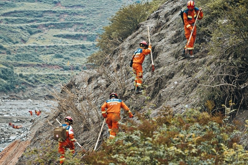 8月9日,國(guó)家西北區(qū)域應(yīng)急救援中心指戰(zhàn)員在馬坡鄉(xiāng)舊莊溝村攜帶搜救犬配合大型機(jī)械搜救失聯(lián)人員。