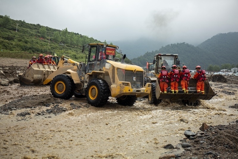 8月9日,國(guó)家西北區(qū)域應(yīng)急救援中心指戰(zhàn)員在馬坡鄉(xiāng)舊莊溝村依托大型機(jī)械渡河開(kāi)展搜救工作。