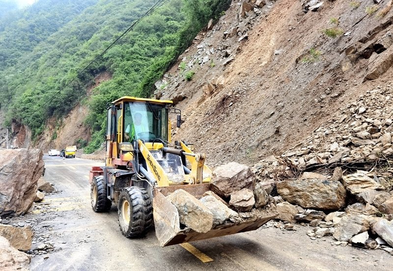 8月10日,在468省道??悼h寺坪鎮(zhèn)升石坪路段,公路養(yǎng)護部門工作人員駕駛裝載機處置路旁垮方。