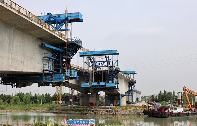 8月12日拍攝的滬寧合高鐵上海特大橋跨羅蘊河連續(xù)梁施工現(xiàn)場(無人機照片)。