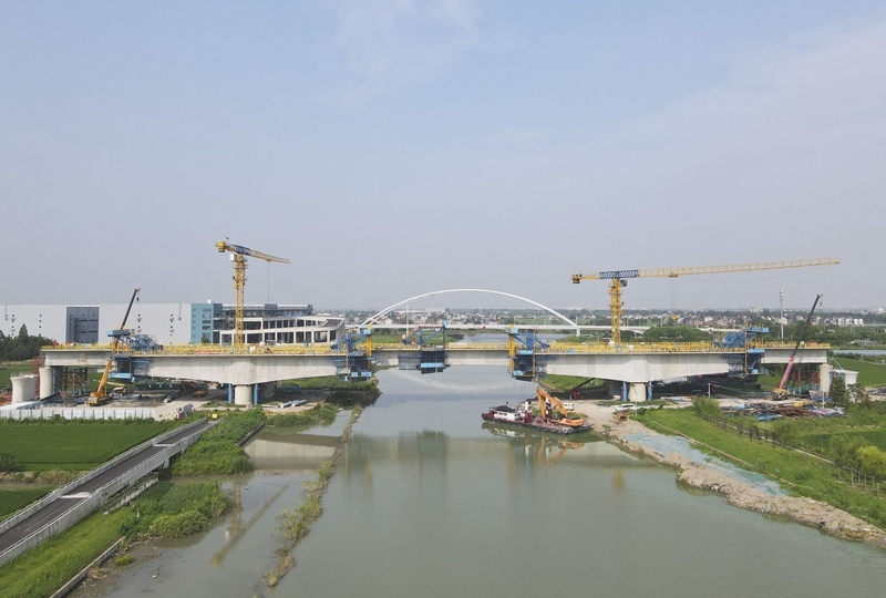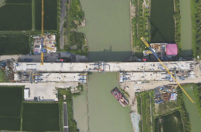 8月12日拍攝的滬寧合高鐵上海特大橋跨羅蘊河連續(xù)梁施工現(xiàn)場,上側(cè)為完成合龍的滬通鐵路二期太徐特大橋跨羅蘊河連續(xù)梁施工現(xiàn)場(無人機照片)。