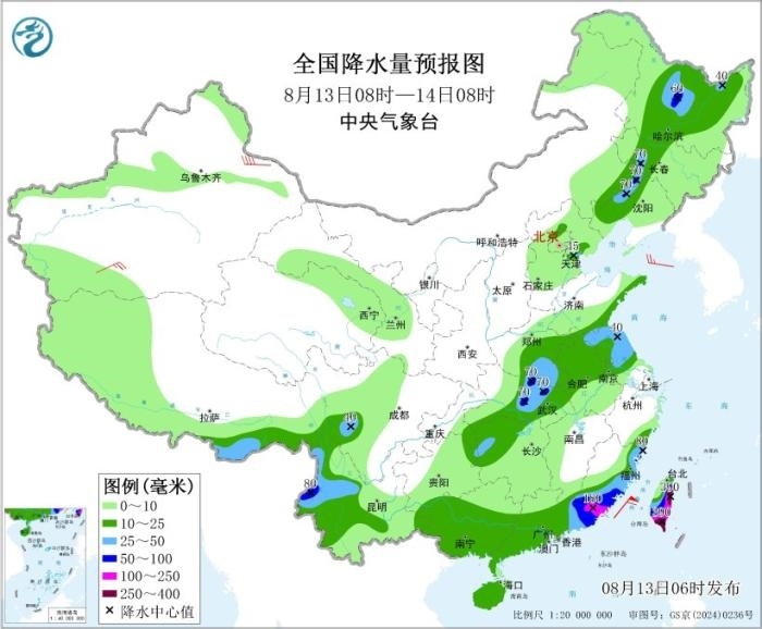 8月13日08時至14日08時,黑龍江中部、吉林西部、遼寧西部、河南南部、湖北中部、江蘇北部、云南西部、廣東東部、福建東部和南部、西藏南部、臺灣島大部等地部分地區(qū)有大到暴雨,其中,福建東南部、廣東東南部、臺灣島東部和南部等地部分地區(qū)有大暴雨,臺灣島東部和南部等地局地特大暴雨(250~390毫米)。臺灣以東洋面有12~13級風(fēng),陣風(fēng)14~15級;臺灣海峽、巴士海峽有10~11級風(fēng),陣風(fēng)12~13級。
