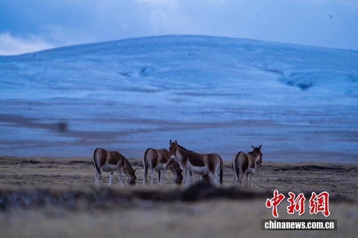 2024年10月23日,中國國家一級保護動物藏野驢在西藏自治區(qū)那曲市安多縣多瑪鄉(xiāng)境內(nèi)的草原上覓食、嬉戲。中新社記者 貢嘎來松 攝