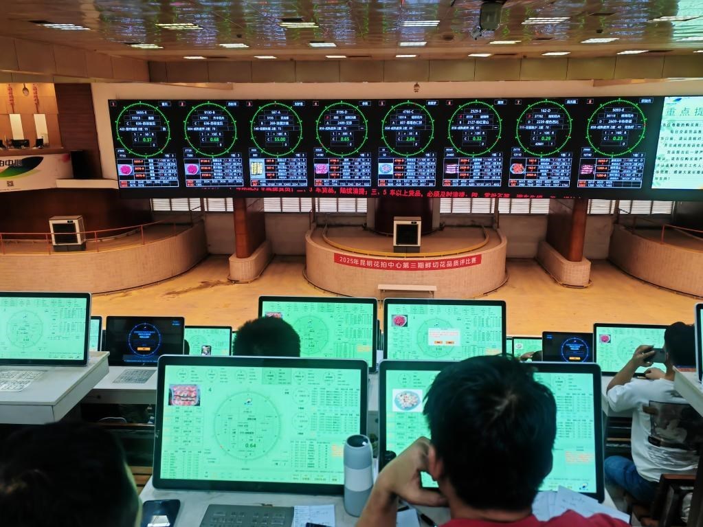 記者在昆明國(guó)際花卉拍賣(mài)交易中心看到,拍賣(mài)大鐘界面顯示著各種花卉的信息,數(shù)百名購(gòu)買(mǎi)商操作著競(jìng)價(jià)器選購(gòu)鮮花。昆明國(guó)際花卉拍賣(mài)交易中心副總經(jīng)理汪洋介紹,這里每天的鮮花交易量都超700萬(wàn)枝,單日最高交易量超1100萬(wàn)枝,30%以上的鮮花被各大電商和直播團(tuán)隊(duì)拍下,他們?cè)倌玫诫娚唐脚_(tái)或直播間銷(xiāo)售。