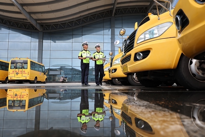 8月25日,湖北省襄陽(yáng)市??悼h公安局交警大隊(duì)民警對(duì)校車進(jìn)行安全檢查(無(wú)人機(jī)照片)。