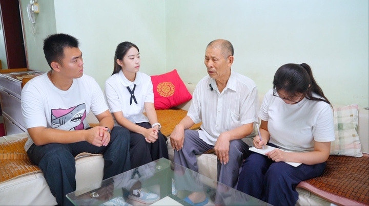 楊村幸存村民王玉璽向尋訪團比劃當年嘴部中彈的經過