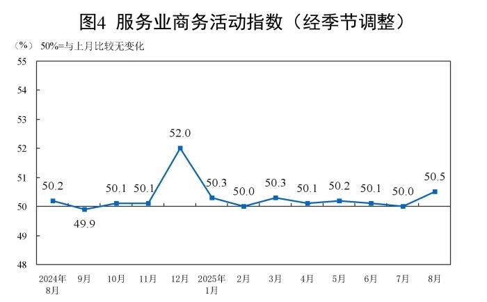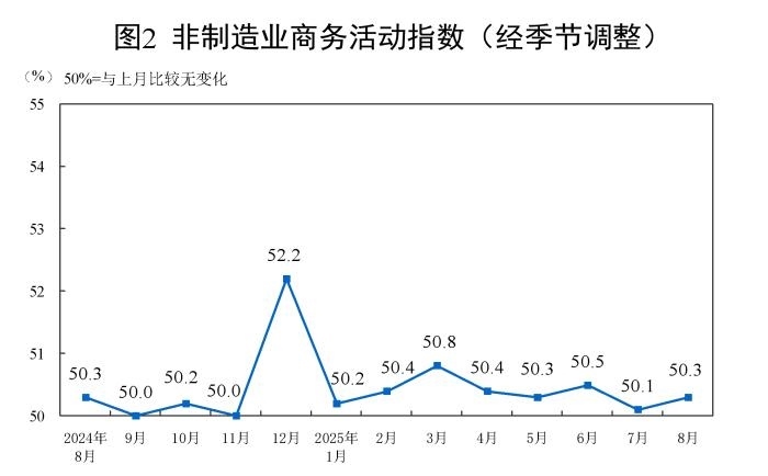 8月份,非制造業(yè)商務(wù)活動指數(shù)為50.3%,比上月上升0.2個(gè)百分點(diǎn),高于臨界點(diǎn),非制造業(yè)繼續(xù)保持?jǐn)U張。