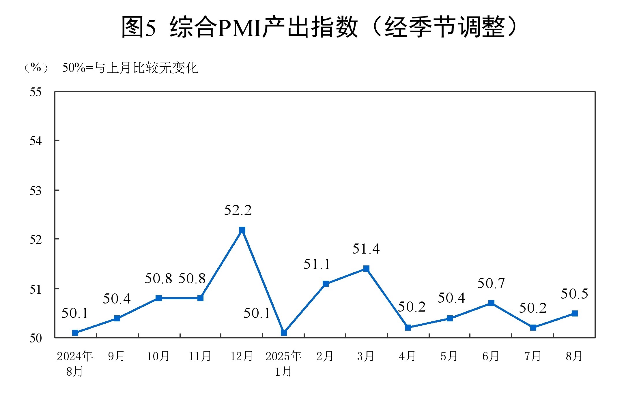 8月份,綜合PMI產(chǎn)出指數(shù)為50.5%,比上月上升0.3個(gè)百分點(diǎn),持續(xù)高于臨界點(diǎn),表明我國企業(yè)生產(chǎn)經(jīng)營活動總體擴(kuò)張有所加快。