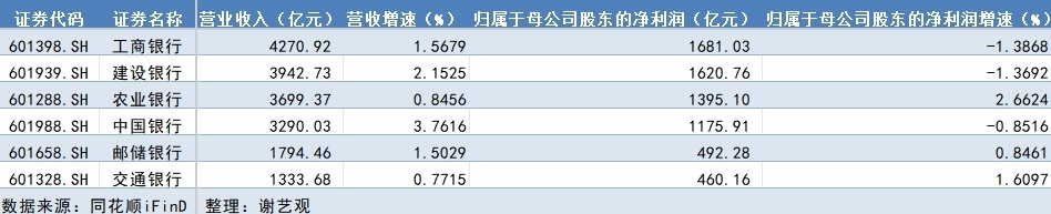 具體來看,農(nóng)業(yè)銀行、交通銀行、郵儲銀行實(shí)現(xiàn)營收和凈利潤指標(biāo)雙增,但工商銀行、建設(shè)銀行、中國銀行歸屬于母公司股東的凈利潤同比有所下降,降幅分別為1.39%、1.37%和0.85%。