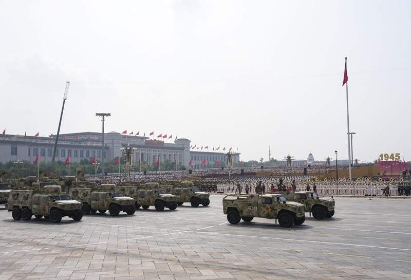 9月3日,紀(jì)念中國(guó)人民抗日戰(zhàn)爭(zhēng)暨世界反法西斯戰(zhàn)爭(zhēng)勝利80周年大會(huì)在北京隆重舉行。這是裝備保障方隊(duì)接受檢閱。